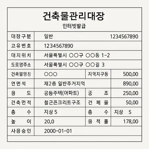 - 일반건축물관리대장: 가장 흔히 사용되며 건물의 전체 정보가 담겨 있음