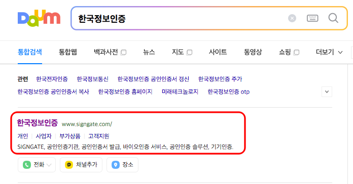 먼저 PC에 저장 중인 공인인증서를 핸드폰으로 옮기려면 한국정보인증 홈페이지에 방문해야 합니다. 여기에서는 다음 포털 검색을 통해 이동해 보도록 하겠습니다.