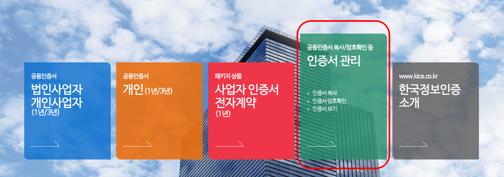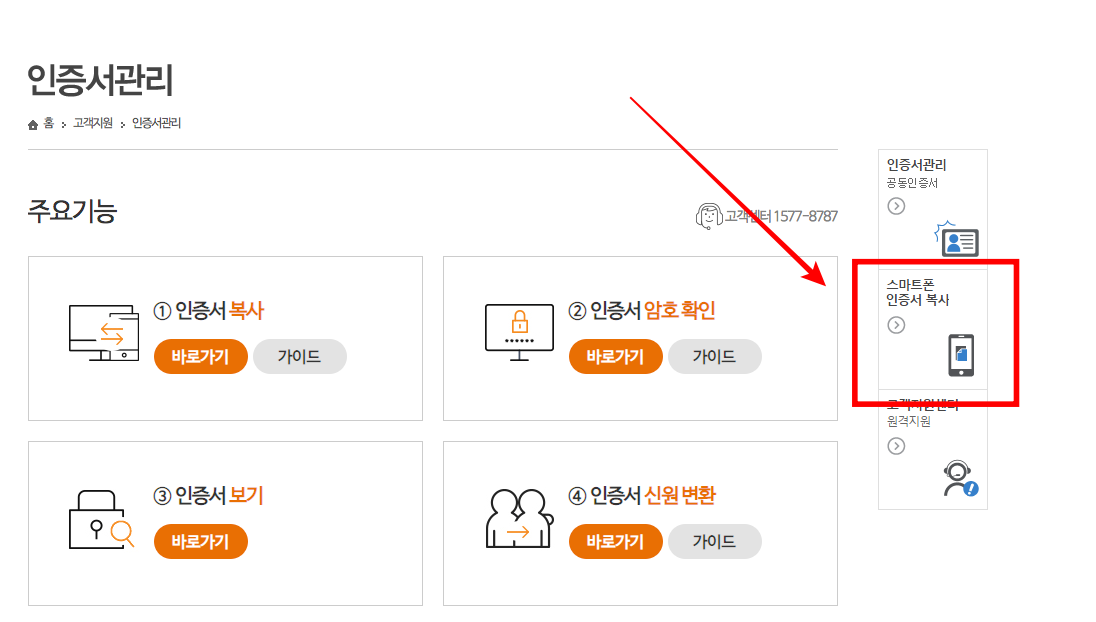 한국정보인증 메인 페이지에서 ‘인증서 관리’ 메뉴를 클릭합니다. 인증서관리 메뉴가 표시되면 우측 바에서 ‘스마트폰 인증서 복사’ 메뉴를 클릭합니다.