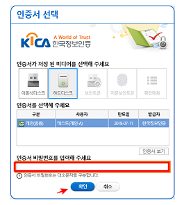인증서 내보내기 버튼을 클릭하면 PC에서 내보낼 인증서 선택 화면이 표시됩니다. 인증서를 선택하시고 암호를 입력한 후 하단에서 확인 버튼을 클릭합니다.