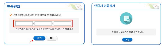 앞서 확인한 스마트폰 어플에 표시된 인증번호 12자리를 PC 화면에 입력하고 하단에서 확인을 선택합니다.