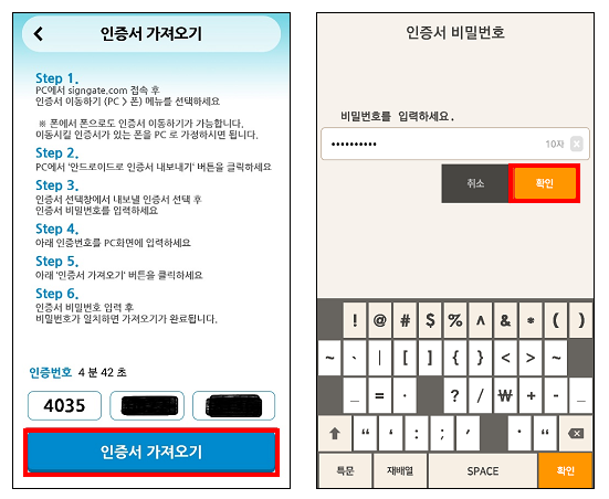 다시 스마트폰으로 돌아가 인증서 가져오고 버튼을 터치하고 가져온 인증서의 비밀번호를 입력한 후 확인 버튼을 터치합니다.
