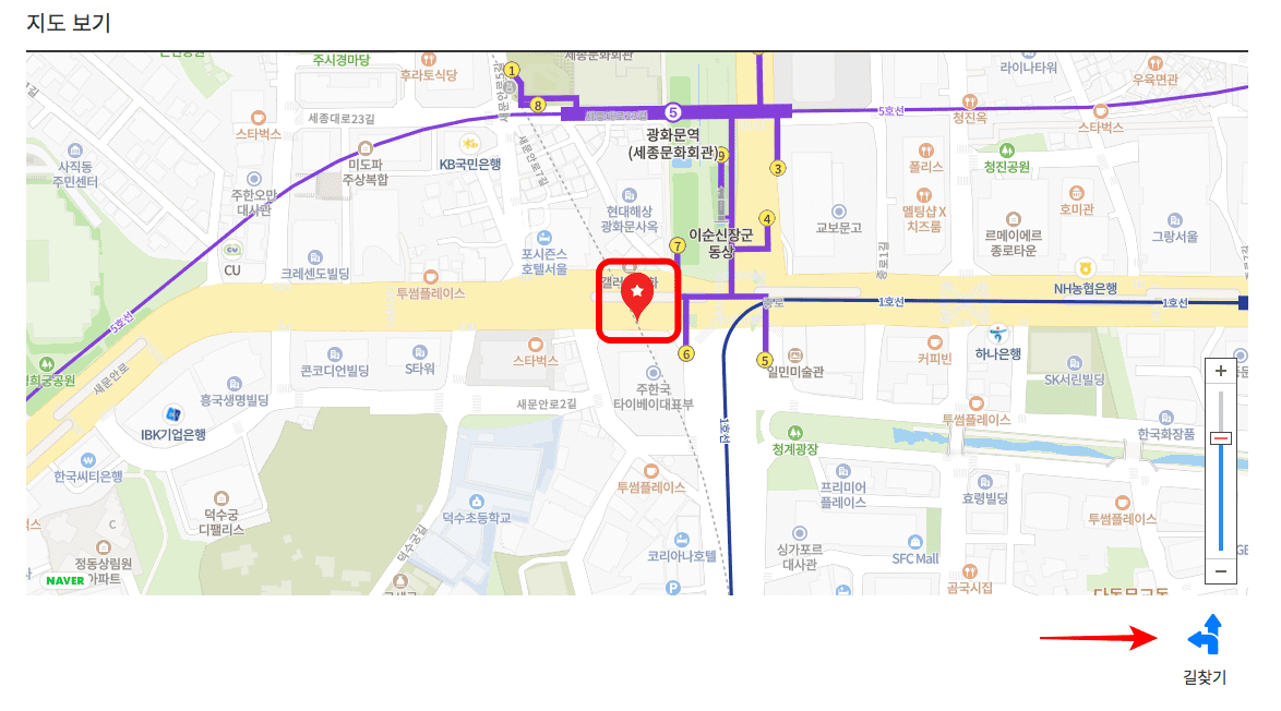 광화문 빌딩 앞 공중전화의 전화번호와 주소를 확인할 수 있습니다. 만약 이 번호로 전화가 오게 되면 공중전화에서 발신한 전화라는 것을 알 수 있습니다. 하단에서는 지도 위의 위치가 표시됩니다. 하단에서 길 찾기 아이콘을 클릭합니다. 내 위치에서부터 공중전화까지의 경로가 자세히 안내됩니다.