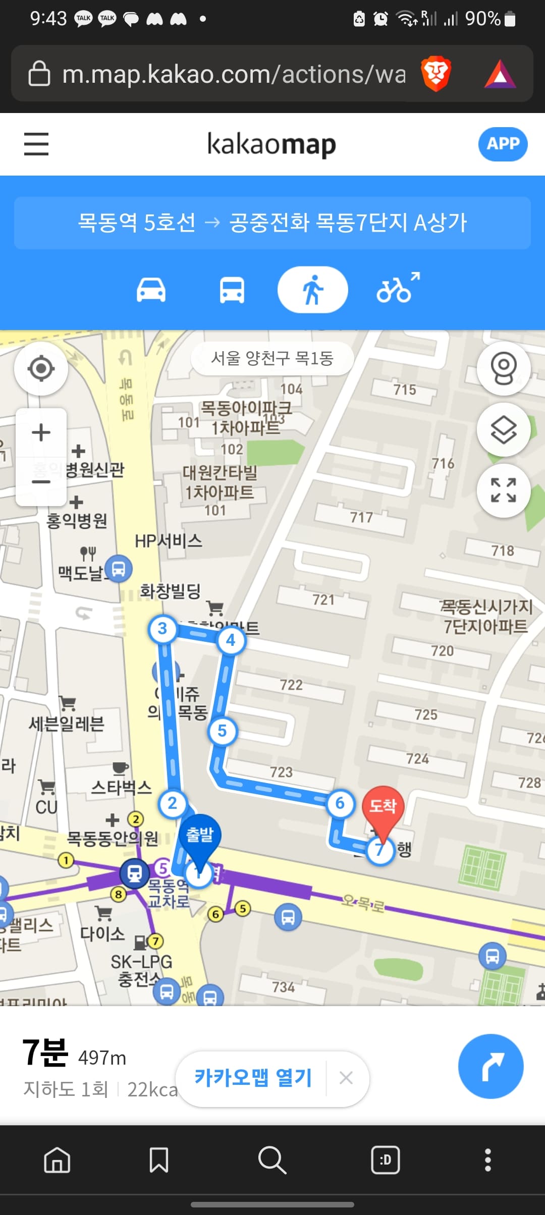 이번에는 거주지 인근의 공중전화를 찾아보겠습니다. 공중전화는 보통 지하철 역에 많이 분포되어 있습니다. 거주지 인근 역이름 + 공중전화를 입력합니다. 목동역 공중전화 위치가 표시되면 길 찾기 버튼을 터치합니다.