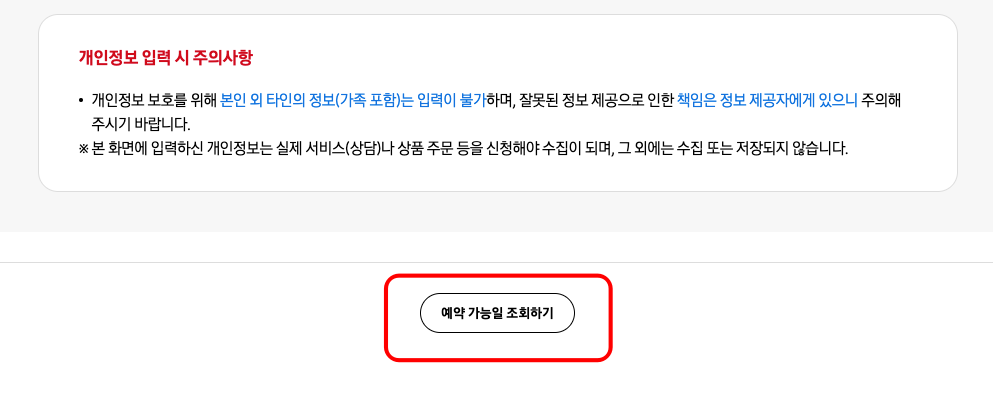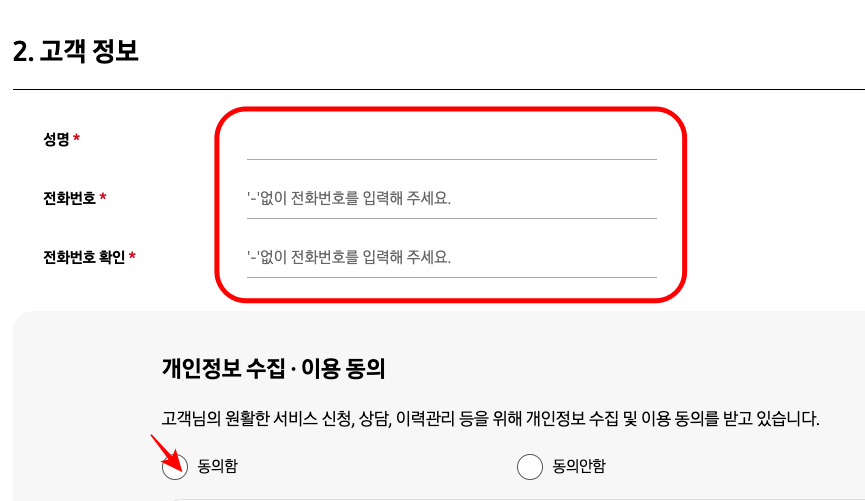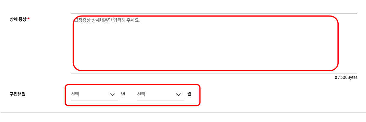 이후 상세증상과 구입년월을 입력합니다. 고객정보에 성명과 전화번호 전화번호 확인 및 개인정보 수집 및 이용동의에 동의함을 표시합니다. 이후 하단에서 예약 가능일 조회하기를 클릭하여 상담을 원하는 날짜를 선택하면 완료됩니다.
