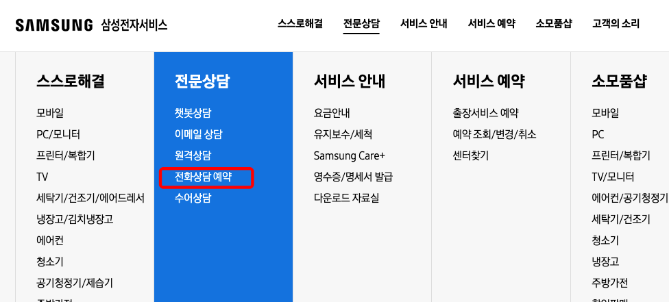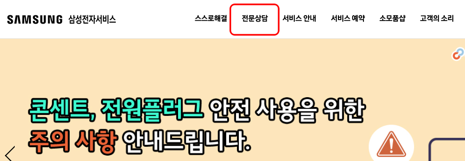 삼성전자 서비스센터 전화상담 예약 방법을 알아보겠습니다. 먼저 삼성전자 서비스센터 홈페이지로 방문하시면 위와 같은 화면을 보실 수 있습니다. 상단 메뉴에서 ‘전문상담’ 위로 마우스를 올려줍니다.