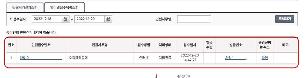 마지막으로 인터넷 접수 목록 조회 화면으로 이동해서 발급 상태를 확인하시고 열람 및 출력을 하시면 됩니다.