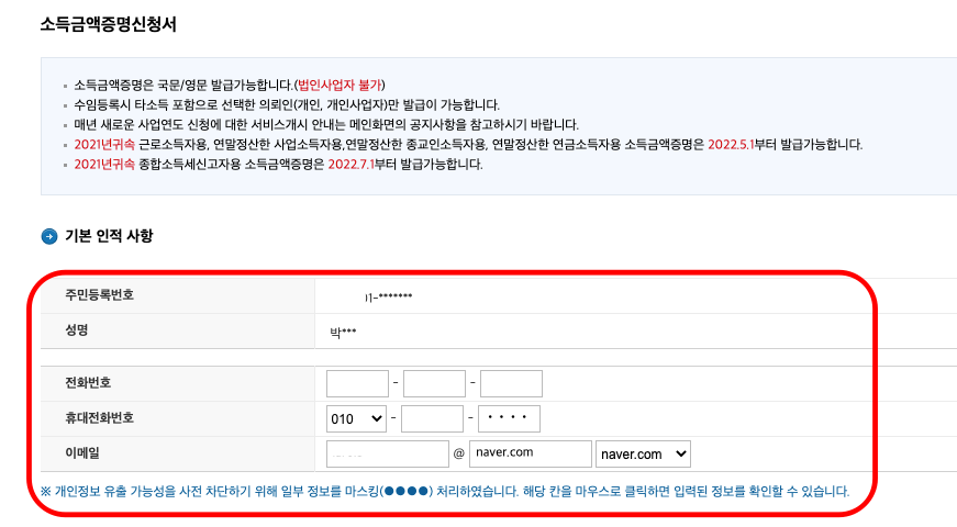 소득금액 증명 신청서 페이지가 표시됩니다. 먼저 기본 인적사항에 전화번호 이메일 정보 등이 맞는지 확인합니다.