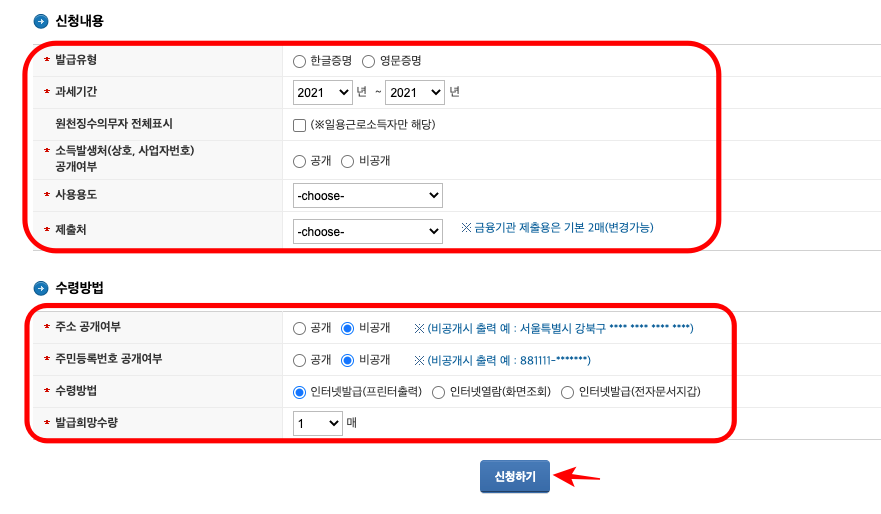 다음 신청내용에 발급 유형, 고세 기간, 소득발생처 공개 여부, 사용용도, 제출처를 입력합니다. 이후 수령방법에 주소 공개여부, 주민등록번호 공개여부, 수령방법, 발급 희망 수량을 입력하시고 하단에서 ‘신청하기’를 클릭합니다.