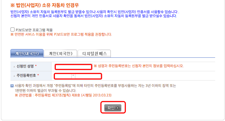 사용자 확인 페이지에서는 개인정보 수집 및 이용에 대한 항목에 모두 동의 표시를 합니다. 하단에서 신청인 성명과 주민등록번호를 입력하고 아래의 확인 버튼을 클릭합니다.