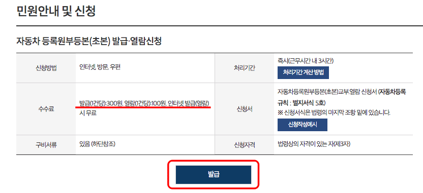 정부 24 홈페이지에 도착하면 검색창에 ‘자동차등록원부’를 입력하고 서비스 바로가기로 이동합니다. 신청메뉴가 표시되면 하단의 발급 버튼을 클릭합니다. 자동차 등록원부등본의 열람은 수수료가 없지만 발급 시 1건당 300원의 수수료가 부과됩니다.