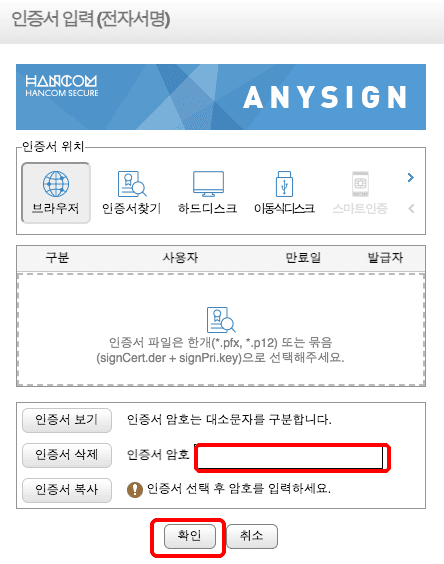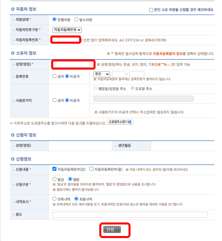 인증서 입력 팝업창이 뜨면 보유하고 있는 공동인증서를 선택하고 암호를 입력한 뒤 확인버튼을 클릭합니다. 신청서 입력 화면이 표시되면 자동차등록번호, 소유자의 성명, 신청내용과 신청구분, 내역표시를 선택한 후 하단에서 신청 버튼을 클릭하면 신청이 완료됩니다.