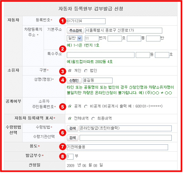 신청화면이 표시되면 자동차 등록번호, 특수주소, 구분, 성명, 수령기관선택, 용도, 발급부수를 입력하시고 하단의 확인버튼을 클릭하면 신청내역에서 처리된 민원내역을 확인할 수 있으며 발급이나 열람이 가능합니다.